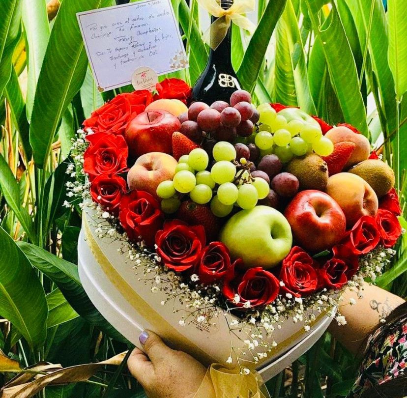 Corazón Frutal Un hermoso corazón frutal acompañado de delicadas rosas 🌹 y frutas al gusto 🍓. Este arreglo es perfecto para expresar amor y frescura. 💕